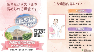 職場見学可/人事評価制度あり/昇給機会あり/残業10h/月以下/電子カルテあり/在宅診療・往診/オンコールなし/マイカー通勤可/転居を伴う転勤なし/男性育児休業取得実績あり |